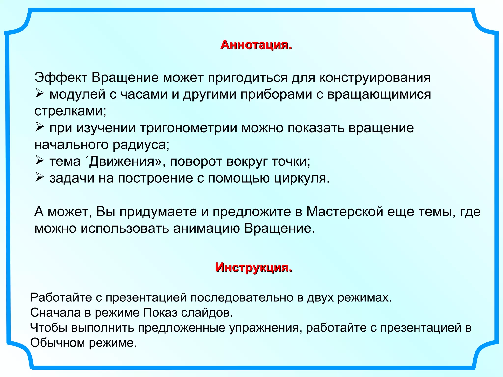 Документ представляет собой методическую разработку по использованию анимации вращения в обучении математике. В нём описываются различные способы демонстрации вращения объектов и их применение в задачах по тригонометрии и механике. Также представлены пошаговые инструкции по созданию мультимедийных презентаций с использованием анимационных эффектов для улучшения учебного процесса.