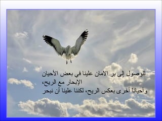 تناقش الوثيقة أهمية الصبر والإيمان في مواجهة الصعوبات، وتؤكد على ضرورة النظر إلى الجانب الإيجابي من الحياة لتحقيق النجاح. تُشير إلى أن القبول والقدرة على التكيف مع الظروف الصعبة تعتبر ضرورية للنمو الشخصي. كما تبرز الفكرة أن الأمور الصغيرة يمكن أن تتحول إلى لحظات عظيمة في المستقبل.