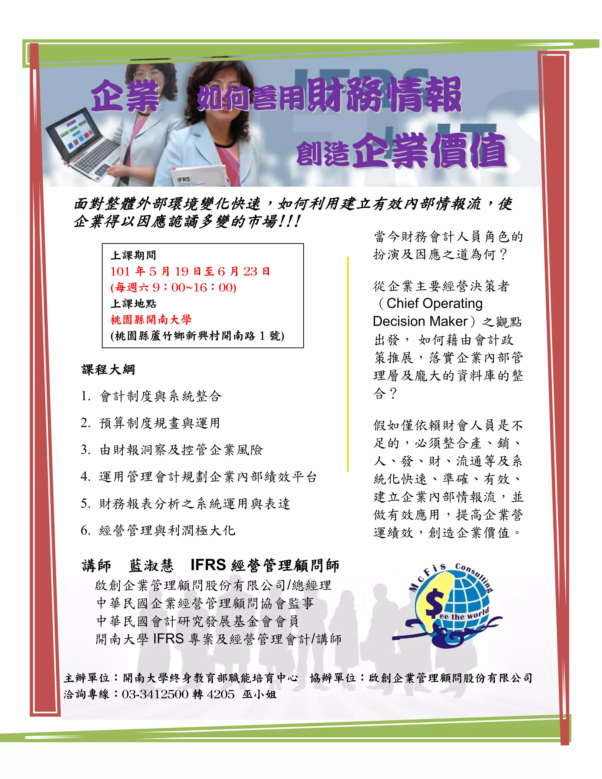 该文档介绍了一个关于企业如何有效利用财务信息以创造价值的课程,主要针对企业管理决策者。课程内容包括会计系统整合、预算规划及运用、企业风险控制等方面,旨在通过会计政策制定和信息系统整合来提升企业内部管理效率。课程由开南大学和启创企业管理顾问公司主办,提供线上报名和费用信息。