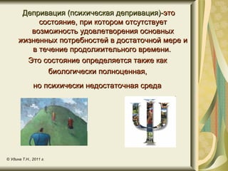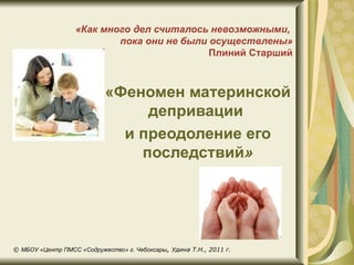 Документ обсуждает последствия материнской депривации, включая ненадлежащие эмоциональные связи с матерью и их влияние на психическое развитие ребенка. Обсуждаются также стратегии преодоления этих последствий и различные факторы риска, такие как неблагополучные семейные условия и влияние отцов. В документе подчеркивается важность активного участия родителей в воспитании, а также выделяются проблемы, с которыми сталкиваются дети с ограниченными возможностями и сложности, связанные с суицидальным поведением у подростков.