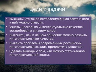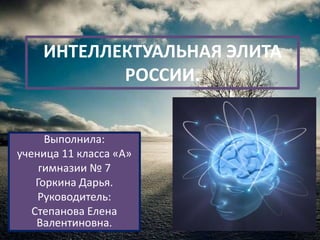 Документ обсуждает концепцию интеллектуальной элиты в России, определяя ее как группу людей с высокими интеллектом и образованием, которые способствуют развитию общества. Рассматриваются проблемы, с которыми сталкиваются современные интеллектуалы, включая финансовую необеспеченность и падение престижа. Также предлагаются способы развития интеллектуальных способностей и подчеркивается важность формирования интеллектуального труда с раннего возраста для прогресса общества.
