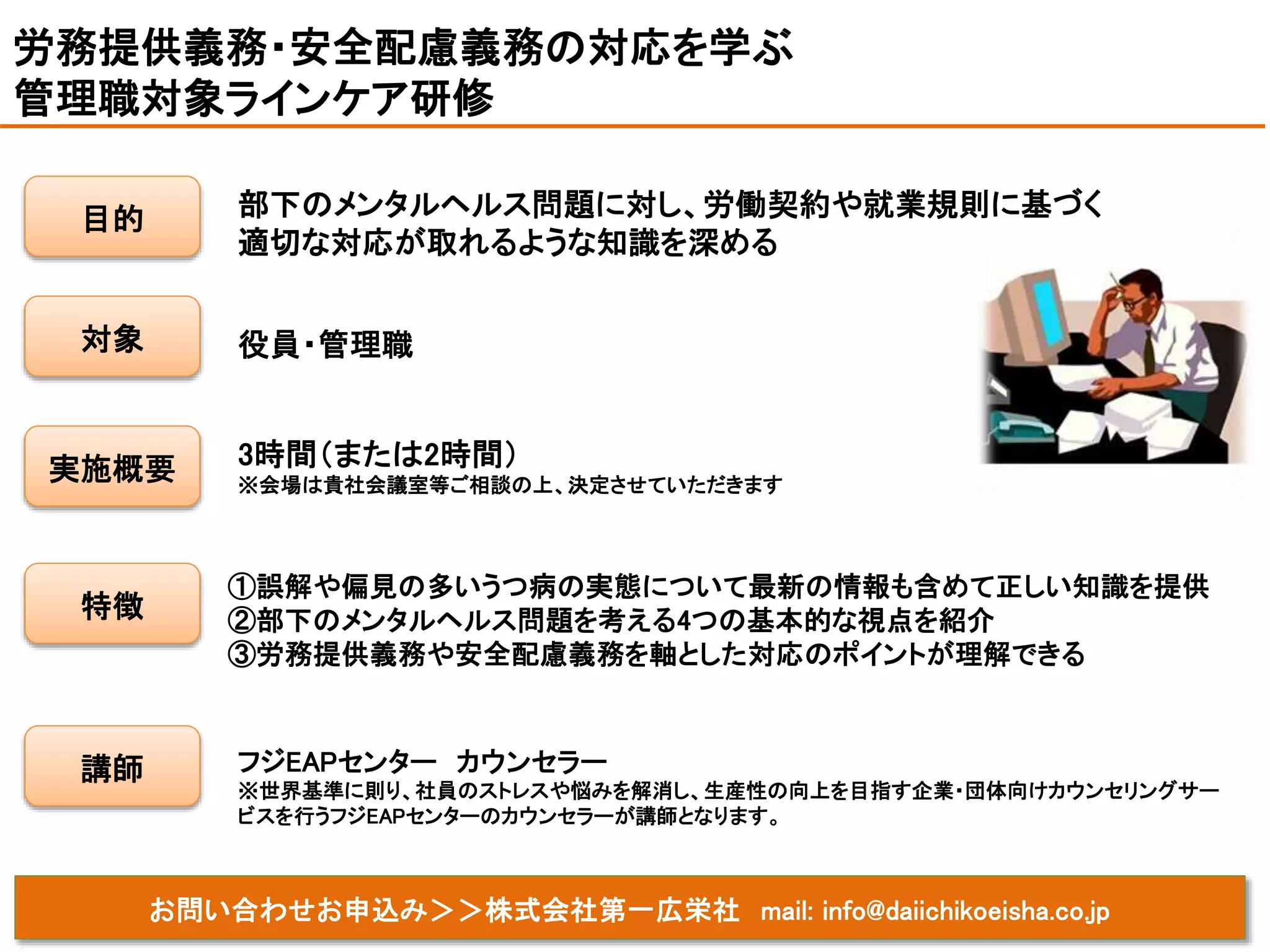 お問い合わせお申込み>>株式会社第一広栄社 mail: info@daiichikoeisha.co.jp 部下のメンタルヘルス問題に対し、労働契約や就業規則に基づく 適切な対応が取れるような知識を深める 労務提供義務・安全配慮義務の対応を学ぶ 管理職対象ラインケア研修 目的 役員・管理職対象 3時間(または2時間) ※会場は貴社会議室等ご相談の上、決定させていただきます 実施概要 ①誤解や偏見の多いうつ病の実態について最新の情報も含めて正しい知識を提供 ②部下のメンタルヘルス問題を考える4つの基本的な視点を紹介 ③労務提供義務や安全配慮義務を軸とした対応のポイントが理解できる 特徴 フジEAPセンター
