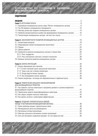 Документ представляет собой руководство по созданию и развитию инновационных центров, охватывающее ключевые факторы успеха, ошибки и закономерности, основанные на опыте мировых лидеров в этой области. Он включает в себя анализ факторов, влияющих на развитие инновационных ecosистем, а также методы привлечения финансирования для стартапов и организации работы управляющих органов центров. В документе также приведены примеры успешных инновационных проектов и рекомендации по их реализации.