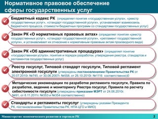 Документ касается системы оказания государственных услуг в Казахстане и включает анализ нормативно-правовой базы, связанной с этой сферой. Он описывает проект закона о государственных услугах, который направлен на расширение понятий и упорядочение функций различных государственных учреждений, а также улучшение качества и доступности услуг для граждан. Также подчеркивается важность общественного контроля и установления прав граждан на получение государственных услуг.