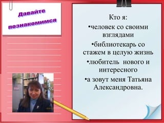 Документ представляет собой визитную карточку библиотекаря Татьяны Александровны, подчеркивающую её значимость для образования и культуры страны. Она описывает свой опыт, семинары и конкурсы, в которых участвовала, а также свои личные и профессиональные убеждения. Визитка содержит призыв к любви к жизни и чтению, подчеркивая важность библиотекарей в обществе.