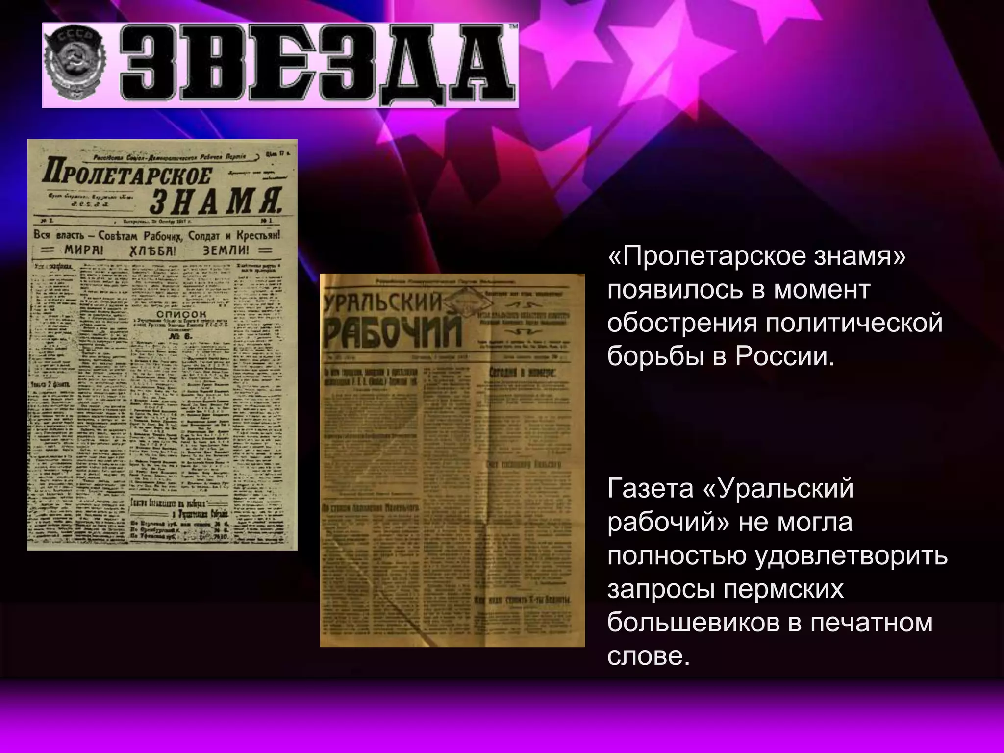 Газета 'Звезда' в Перми появилась в контексте политической борьбы и удовлетворила потребности большевиков в печатном слове. После освобождения Перми Красной армией в 1919 году основной газетой стал 'Красный Урал'. С момента выхода первого номера 'Звезды' 16 июня 1920 года, комплекс продолжает производить полиграфическую продукцию для региона.