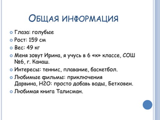 Документ представляет собой автобиографию Ирины, ученицы 6 класса, где она делится информацией о себе, своих интересах и достижениях в учебе и спорте. Она серьезно относится к спорту, особенно к теннису и плаванию, и описывает свой эмоциональный характер, резкость и творческие наклонности. Ирина также упоминает свое отношение к учебе, включая свою оценку интеллектуальных способностей и результаты тестов на IQ и креативность.