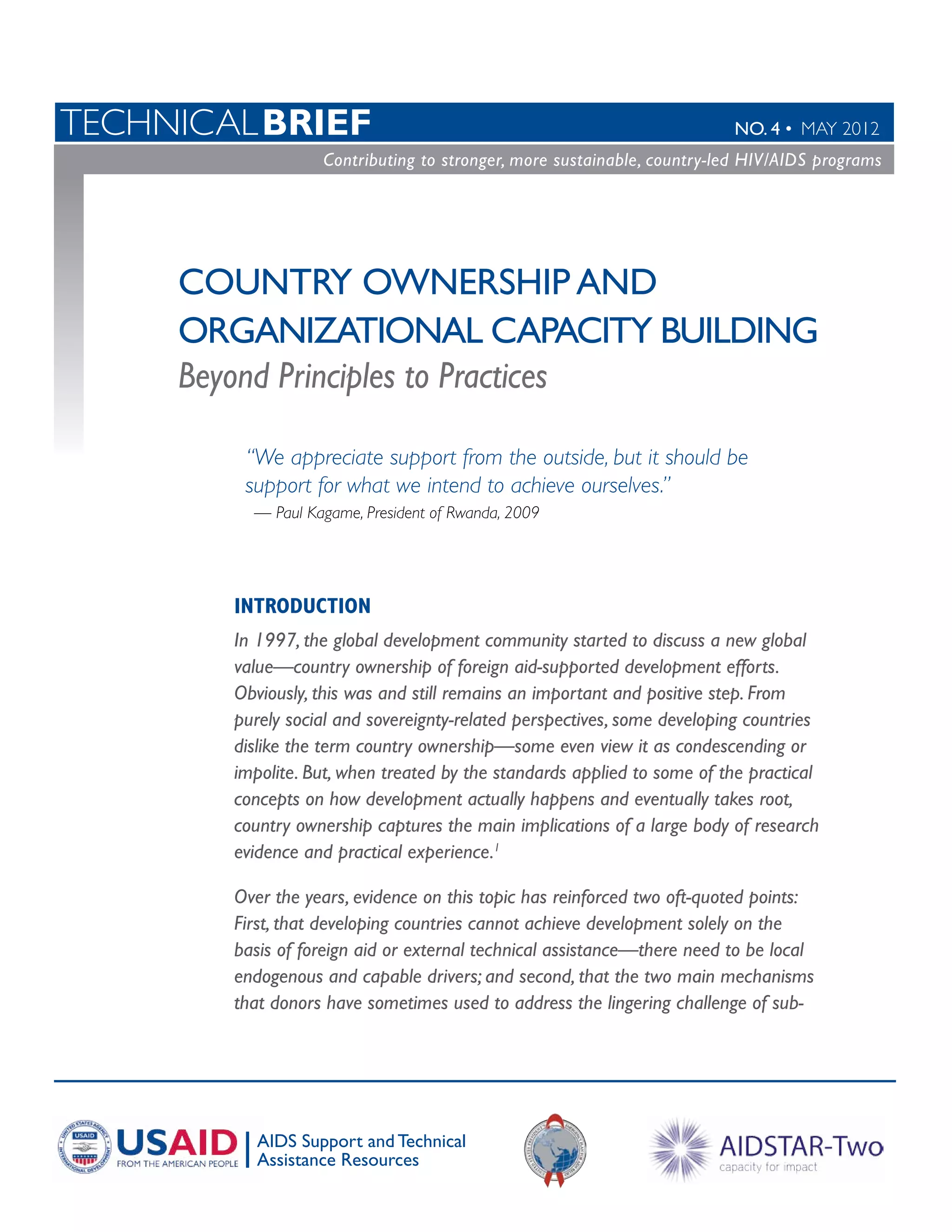 This document discusses country ownership and organizational capacity building in the context of HIV/AIDS programs. It defines country ownership as the full participation of a country's population, including government, civil society, and the private sector, in conceptualizing, implementing, monitoring, and evaluating development policies and programs. While country ownership is not a new concept, challenges remain in achieving it in practice. The document argues that capacity building of both government institutions and civil society organizations is needed to strengthen local leadership and sustainability of HIV/AIDS responses over the long term. It provides examples of how capacity building initiatives have supported greater country ownership in various country contexts.
