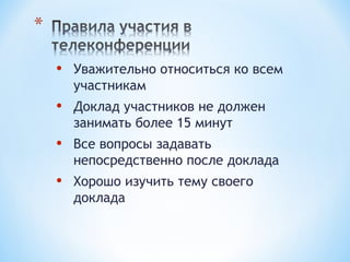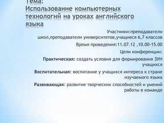 Документ описывает конференцию для преподавателей и учащихся, направленную на формирование у учеников интереса к иностранному языку и развитию творческих навыков. В нем указаны временные рамки и структура мероприятия, включая приветствие, знакомство, слушание докладов, паузу и обсуждение итогов. Участники должны уважительно относиться друг к другу, а доклады не должны превышать 15 минут.