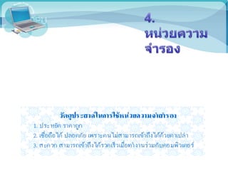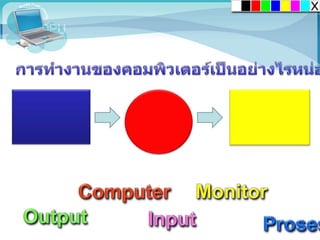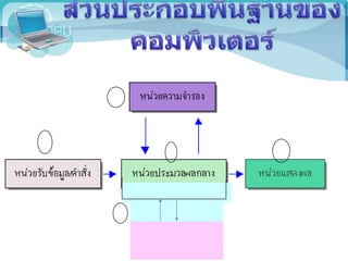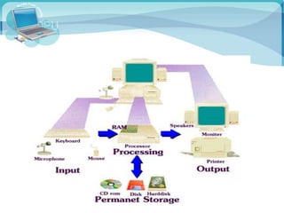1. The document describes the basic components of a computer system including input devices, output devices, storage devices, and processing units. 2. Input devices take data and instructions from the outside world and send them to the central processing unit. Common input devices include keyboards, mice, scanners, and digital cameras. 3. Output devices take information from the central processing unit and present it for humans to see and interact with. Common output devices include monitors, printers, and plotters.