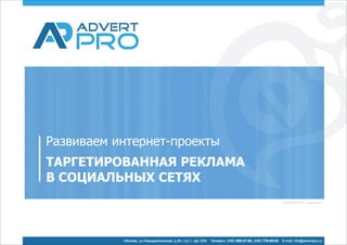 Документ описывает услуги таргетированной рекламы в социальных сетях, предлагая гибкие настройки для достижения целевой аудитории по демографическим и географическим критериям. Основные преимущества включают рост продаж, повышение узнаваемости бренда и подробную аналитику рекламных кампаний. Также указана контактная информация компании "адвертпро" для получения дополнительных сведений.