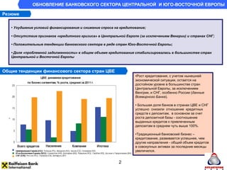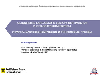 Документ анализирует состояние банковского сектора центральной и юго-восточной Европы с акцентом на Украину, подчеркивая ухудшение условий финансирования и слабое кредитование. В 2011 году украинская экономика показала небольшой рост, но остаются значительные риски, включая высокую долю проблемных займов. Для улучшения финансового состояния региона необходимы структурные реформы и снижение зависимости от внешних источников финансирования.