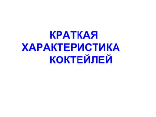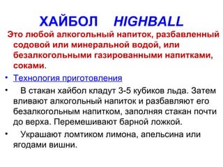 Документ описывает различные коктейли и их рецепты, включая хайболы, коллинзы, крюшоны, глинтвейн и пунши. Указаны технологии приготовления и ингредиенты для каждого типа коктейля, а также советы по украшению напитков. Документ также касается методов создания сауэр-коктейлей, таких как маргарита.