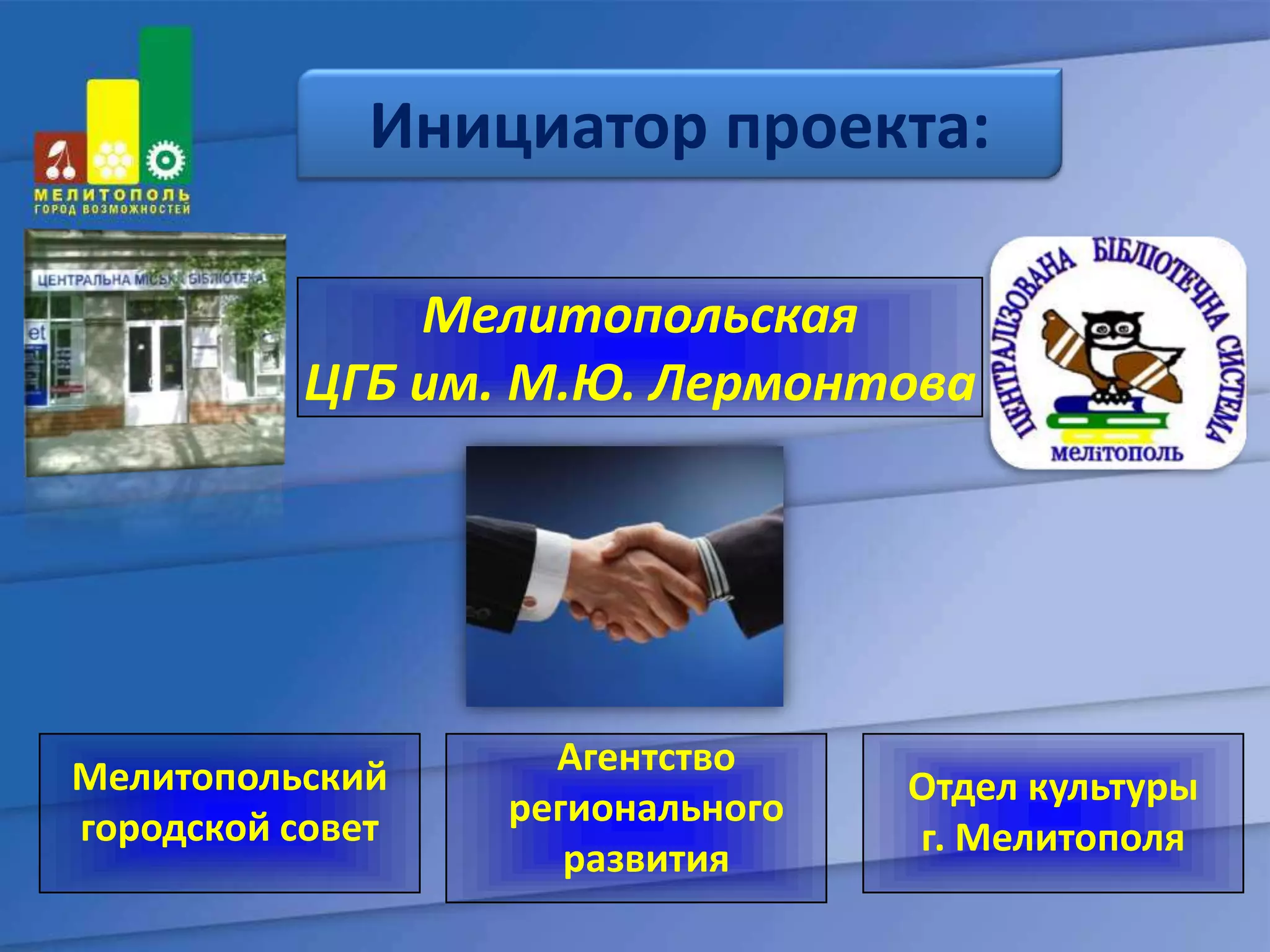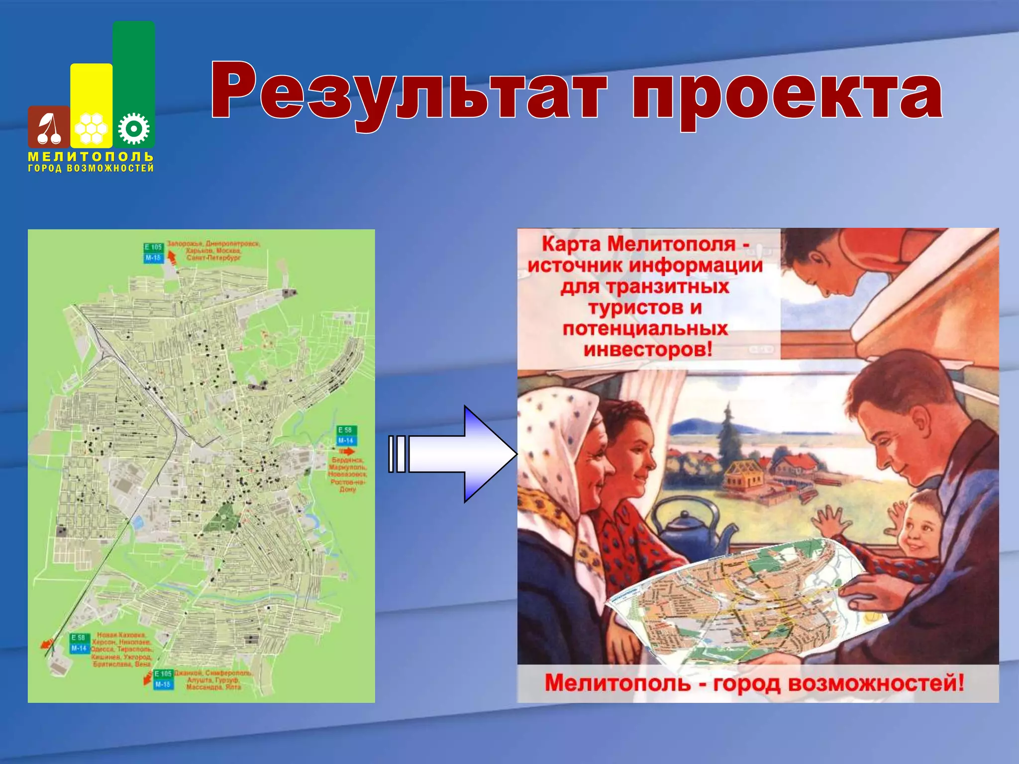 Проект инициирован мелитопольской центральной городской больницей и агентством регионального развития для проведения конкурса и семинара для библиотечных сотрудников. В опросе участвовало более 300 респондентов, и создали систему распространения инвестиционно-туристической карты для гостей города. Итоговая пресс-конференция прошла в Мелитополе.