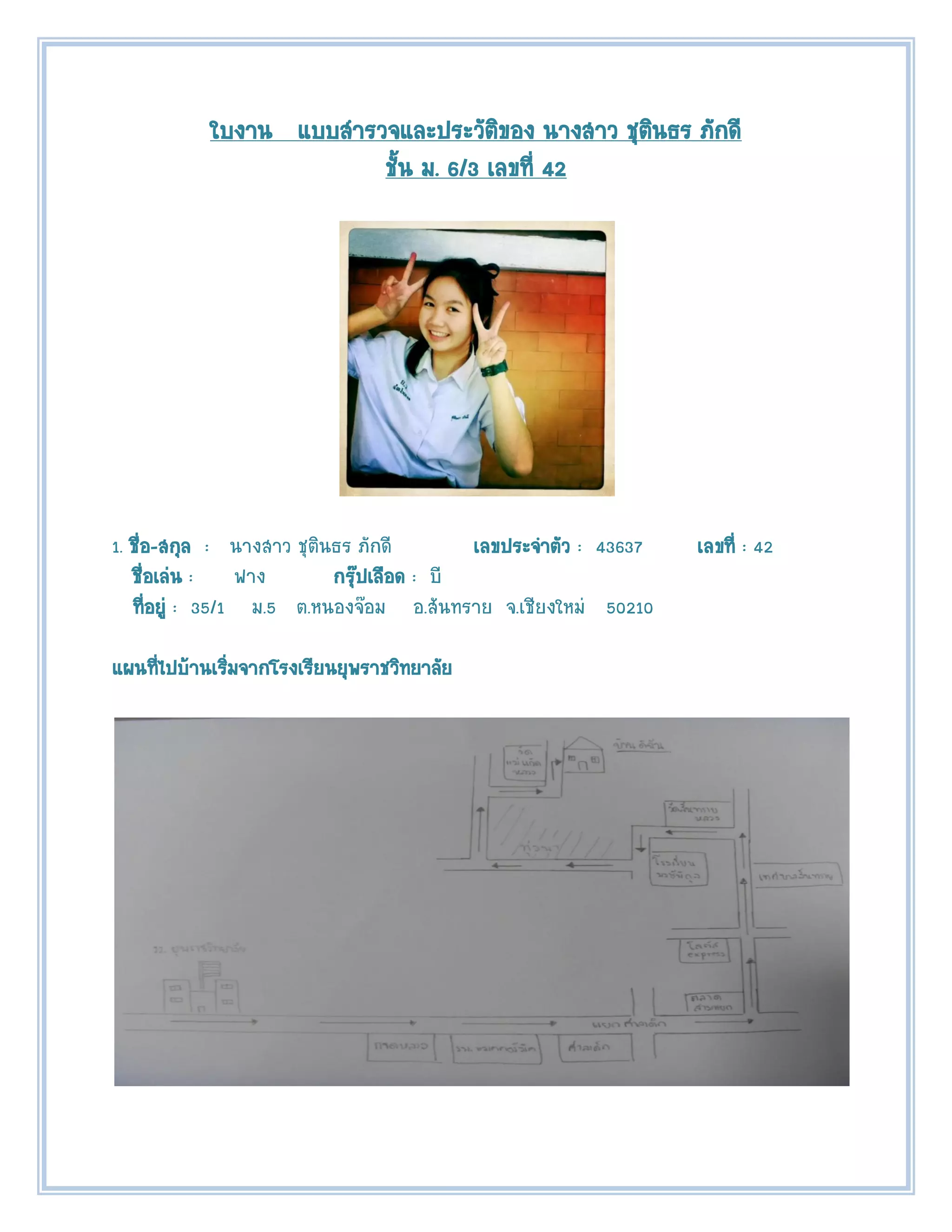 ชุตนธร ภักดี ิ ิ ชัน ม. 6/3 เลขที่ 42 ้ 1. ชือ-สกุล : นางสาว ชุตินธร ภักดี ่ เลขประจาตัว : 43637 เลขที่ : 42 ชือเล่น : ฟาง ่ กรุ๊ปเลือด : บี ทีอยู่ : 35/1 ม.5 ต.หนองจ๊อม อ.สันทราย จ.เชียงใหม่ 50210 ่ แผนทีไปบ้านเริมจากโรงเรียนยุพราชวิทยาลัย ่ ่