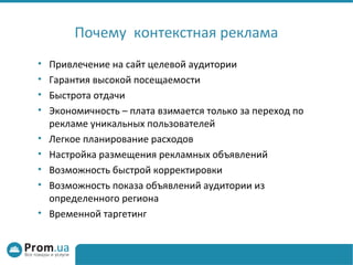 Документ описывает основные инструменты и правила настройки контекстной рекламы для привлечения целевой аудитории и повышения посещаемости сайта. Он включает советы по выбору ключевых слов, созданию эффективных объявлений и оценке их эффективности. Также подчеркивается важность квалифицированных специалистов в этой области.