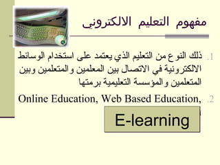التعليم الإلكتروني هو نوع من التعليم يعتمد على الوسائط الإلكترونية لتسهيل التواصل بين المعلمين والمتعلمين، ويتميز بتوسيع عملية التعلم لتتجاوز جدران الفصول التقليدية. يشمل أنماطًا مثل التعليم المتزامن وغير المتزامن والتعليم المدمج الذي يجمع بين أساليب مختلفة. يوفر التعليم الإلكتروني مزايا عديدة مثل زيادة إمكانية الوصول والمساواة وسهولة الوصول إلى المعلم.