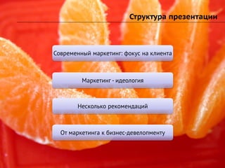 Документ рассматривает современный подход к маркетингу, акцентируя внимание на клиенте и необходимости индивидуализации предложений. Он подчеркивает ключевую роль сотрудников в маркетинговой стратегии и предлагает рекомендации по развитию бизнеса через маркетинг как на внешнем, так и на внутреннем уровне. Также поднимается вопрос о внедрении новых технологий и изменении подходов к мотивации и отбору персонала.