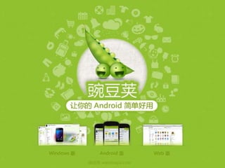 大家好,我是来自豌豆荚的刘亚平,在豌豆荚我主要负责产品设计。很高兴能有机会跟大家聊聊一些关于应用分发的话题。我相信来到这里的,大多数都是应用开发者。千辛万苦开发出来一款 app,肯定希望更多人知道和使用,那么我也一样,所以我还是想首先介绍下豌豆荚。豌豆荚是一款 给 Android 手机用的手机管理软件,产品包括了 Windows 版,Android 版 和 Web 版,我们的特点是简单好用,这样也获得了很多 Android 用户的认可和喜爱。