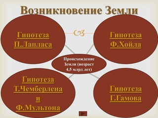 Документ обсуждает различные гипотезы о происхождении Земли, включая гипотезы П. Лапласа, Ф. Хойла, Т. Чемберлена и Г. Гамова, а также факторы, способствующие возникновению жизни на планете. Описываются условия, необходимые для жизни, такие как оптимальное расстояние от Солнца, наличие атмосферы и воды, а также теории о возникновении жизни, включая биогенез и абиогенез. Кроме того, подчеркивается важность бережного отношения к природным ресурсам и взаимосвязь человека с природой.