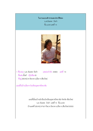 ํ ั ิ น.ส.ธันยพร ผิวคํา ชั้น ม.6/6 เลขที่ 14 1. ชื่อ-สกุล น.ส. ธันยพร ผิวคํา เลขประจําตัว 40983 เลขท่ี 14 ชื่อเลน มิ้นท กรุปเลือด B ที่อยู 285/402 ต.วัดเกต อ.เมือง จ.เชียงใหม แผนที่ไปบานเริ่มจากโรงเรียนยุพราชวิทยาลัย แผนที่เยี่ยมบานนักเรียนโรงเรียนยุพราชวิทยาลัย จังหวัด เชียงใหม น.ส. ธนยพร ผวคา เลขท่ี 14 ชั้น ม.6/6 ั ิ ํ บานเลขที่ 285/402 คายกาวิละ ต.วัดเกต อ.เมือง จ.เชียงใหม 50000