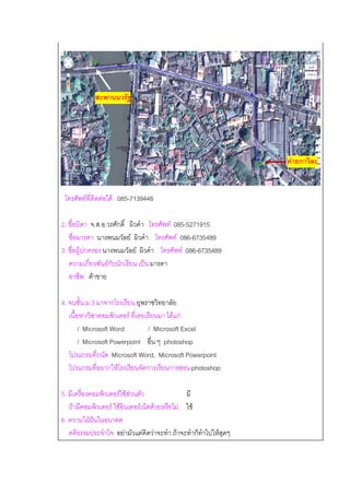 ั คายกาวิละ โทรศัพทที่ติดตอได 085-7139448 2. ชื่อบิดา จ.ส.อ.วรศักดิ์ ผิวคํา โทรศัพท 085-5271915 ชือมารดา นางพนมวัลย ผิวคํา โทรศัพท 086-6735489 ่ 3. ชื่อผูปกครอง นางพนมวัลย ผิวคํา โทรศัพท 086-6735489 ความเกี่ยวพันธกับนักเรียน เปน มารดา อาชพ คาขาย ี 4. จบชั้น ม.3 มาจากโรงเรียน ยุพราชวิทยาลัย เนื้อหา/วิชาคอมพิวเตอร ที่เคยเรียนมา ไดแก / Microsoft Word / Microsoft Excel / Microsoft Powerpoint อื่น ๆ photoshop โปรแกรมที่ถนัด Microsoft Word, Microsoft Powerpoint โปรแกรมที่อยากใหโรงเรียนจัดการเรียนการสอน photoshop 5. มเี ครองคอมพวเตอรใชสวนตว ่ื ิ ั มี ถามีคอมพิวเตอร ใชอินเทอรเน็ตดวยหรือไม ใช 6. ความใฝฝนในอนาคต คติธรรมประจําใจ อยามัวแตคิดวาจะทํา ถาจะทําก็ทําไปใหสุดๆ