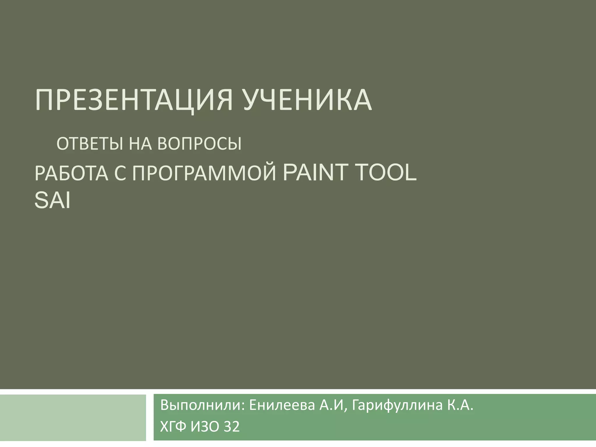 Презентация описывает работу с программой Paint Tool SAI, выполненную ученицами Енилеевой А.И. и Гарифуллиной К.А. Она охватывает основы изображения на плоскости, различные жанры графики и используемые инструменты для рисования, включая карандаши и пастель. Также представлены результаты работы в данной программе.