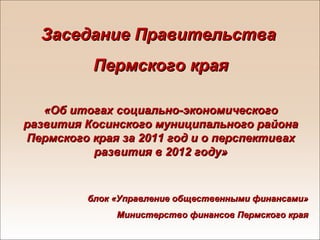 Заседание правительства Пермского края рассматривало итоги социально-экономического развития Косинского муниципального района за 2011 год и перспективы на 2012 год, с акцентом на высокую дотационность района. Обсуждены вопросы задолженности муниципальных учреждений перед бюджетами, а также принятие нормативных правовых актов на уровне местных властей. Общая оценка управления общественными финансами в районе была признана хорошей, однако некоторые аспекты деятельности вызвали замечания.