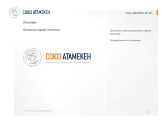Документ представляет собой руководство по логотипу союза «Атамекен», включая основной логотип, его вариации, цветовые схемы и шрифты. Он описывает различные компоновки и языковые версии логотипа, а также предлагает полихромные и монохромные варианты. В конце документа представлены контактные данные и ссылки на социальные сети союза.