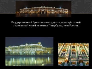 Государственный Эрмитаж в Санкт-Петербурге, основанный в 1764 году Екатериной Великой, является одним из самых знаменитых музеев России, обладающим более 2,7 миллионов экспонатов. В музейном комплексе представлены произведения великих мастеров, таких как Да Винчи, Моне и Ренуар, а также проводится множество культурных мероприятий, включая концерты и театральные спектакли. Эрмитаж включает в себя Зимний дворец, Малый и Старый Эрмитаж, построенные в разные исторические периоды и представляющие собой выдающиеся архитектурные памятники.