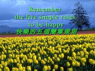 The document provides simple rules for being happy, including freeing your heart from hatred and worries, living simply, giving more than demanding, and expecting miracles. It encourages moving past disappointments and realizing that life's events are meant to teach valuable lessons. While you can't make someone love you, you can better yourself to be more lovable. Friendship is like wine in that it improves with age.