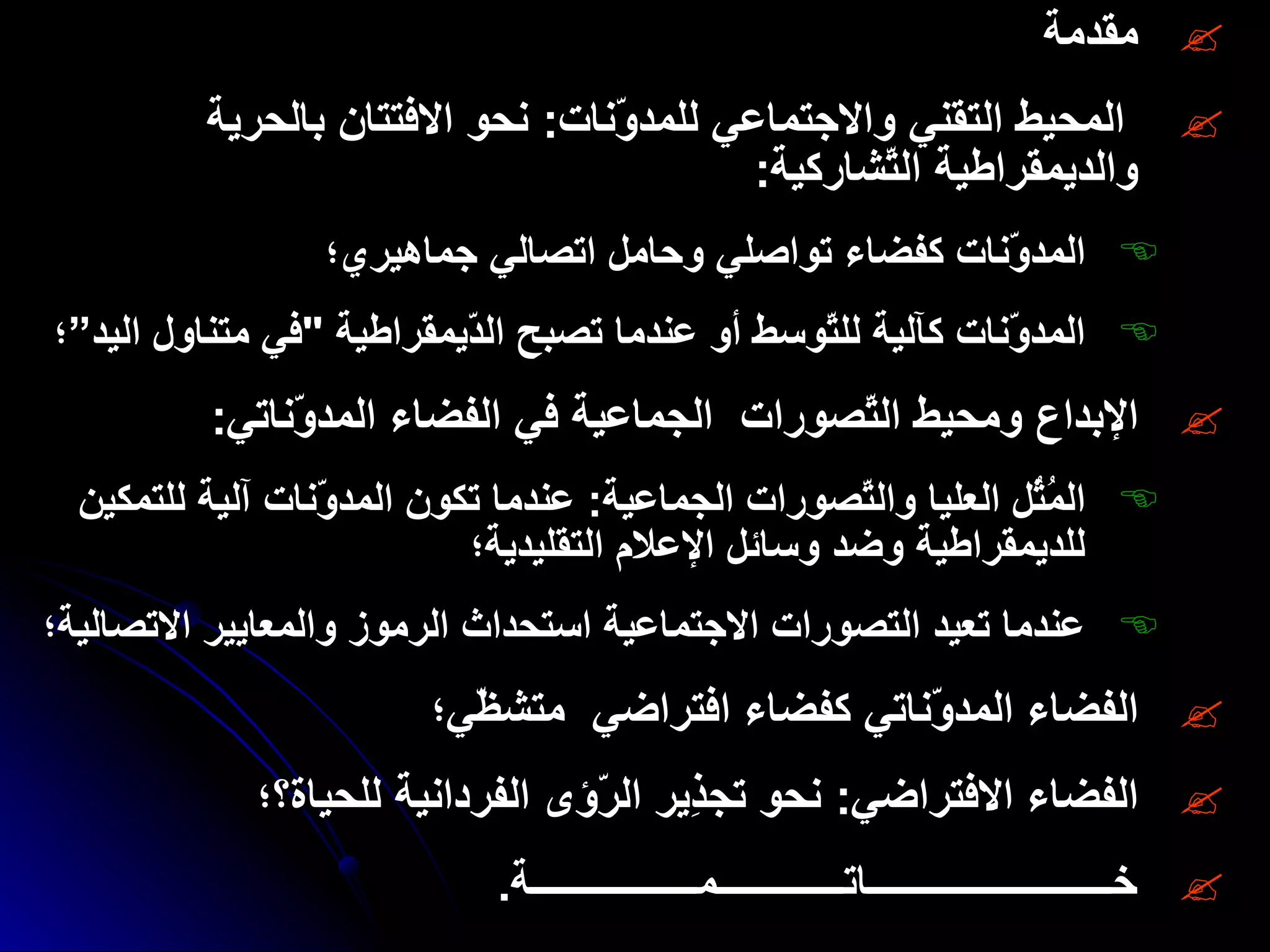 يتناول المستند دور المدونات كفضاء تواصلي يمكّن من الديمقراطية ويشكل بديلاً عن وسائل الإعلام التقليدية، مع التأكيد على إشكاليات تمثيل الفئات الاجتماعية والتصورات الجماعية. كما يبرز تطور المدوّنات وتصاعد عددها في الفضاء الرقمي كأداة للتعبير والمشاركة. يتطرق النص إلى تجارب إعلامية مبتكرة وتحديات تتعلق بالحرية والنقاش العام.