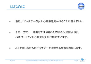 最近、「ビッグデータ」という言葉を見かけることが増えました。 その一方で、一時期もてはやされたWeb2.0と同じような、 バズワードだという意見も見かけ始めています。 ここでは、私たちのビッグデータに対する見方をお話します。 May 2012 Copyright © 2011-2012 Gemini Mobile Technologies Inc. & KK All Rights Reserved. Page 2