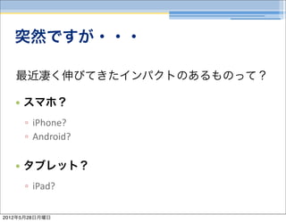 最近凄く伸びてきたインパクトのあるものって? • スマホ? ▫ iPhone? ▫ Android? • タブレット? ▫ iPad? 2012年5月28日月曜日