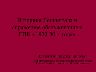 Документ рассматривает историю информационно-библиографического отдела Российской национальной библиотеки в Ленинграде в 1920-30-х годах. Особое внимание уделяется профессиям и личностям, связанным с этой областью, включая таких людей, как Юрий Алексеевич Меженко и Лидия Корнеевна Чуковская. Включены ссылки на исследования, описывающие развитие библиографической службы библиотеки.