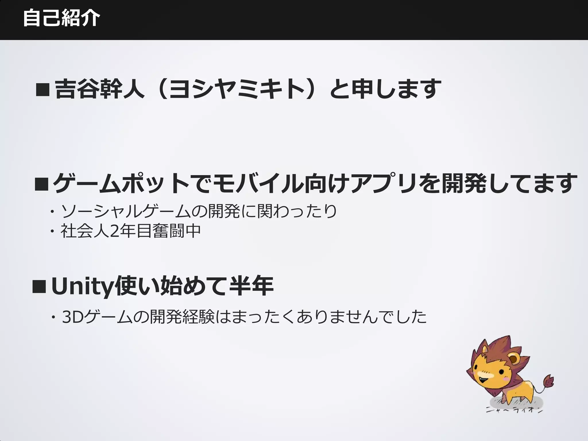 自己紹介 ■吉谷幹人(ヨシヤミキト)と申します ■ゲームポットでモバイル向けアプリを開発してます ・ソーシャルゲームの開発に関わったり ・社会人2年目奮闘中 ■Unity使い始めて半年