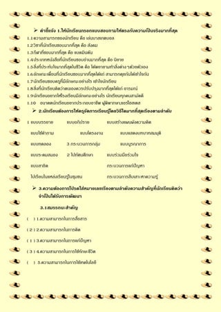 ุด ั ็ 1.1 ความสามารถของนักเรียน คือ เล่นบาสเกตบอล 1.2 วิชาที่นกเรียนชอบมากที่สด คือ สังคม ั ุ 1.3 กีฬาที่ชอบมากที่สด คือ แบดมินตัน ุ 1.4 ประเภทหนังสือที่นกเรียนชอบอ่านมากที่สด คือ นิยาย ั ุ 1.5 สิ่งที่ประทับใจมากที่สดในชีวิต คือ ได้พยายามทาสิ่งต่างๆด้วยตัวเอง ุ 1.6 ลักษณะเพื่อนที่นกเรียนชอบมากที่สดได้แก่ สามารถคุยกันได้เข้าใจกัน ั ุ 1.7 นักเรียนชอบครูที่มีลกษณะอย่างไร เข้าใจนักเรียน ั 1.8 สิ่งที่นกเรียนคิดว่าตนเองควรปรับปรุงมากที่สดได้แก่ อารมณ์ ั ุ 1.9 นักเรียนอยากให้โรงเรียนมีลกษณะอย่างไร นักเรียนทุกคนสามัคคี ั 1.10 อนาคตนักเรียนอยากประกอบอาชีพ ผูพิพากษา,แอร์โฮสเตส ้ 2.นักเรียนต้องการให้คร ูจัดการเรียนรโ้ ู ดยวิธีใดมากที่ส ุดเรียงตามลาดับ 1 แบบบรรยาย แบบอภิปราย แบบสร้างแผนผังความคิด แบบใช้คาถาม แบบโครงงาน แบบแสดงบทบาทสมมุติ แบบทดลอง 3 กระบวนการกลุ่ม แบบบูรณาการ แบบระดมสมอง 2 ไปทัศนศึกษา แบบร่วมมือร่วมใจ แบบสาธิต กระบวนการแก้ปัญหา ไปเรียนในแหล่งเรียนรูใ้ นชุมชน กระบวนการสืบเสาะหาความรู้ 3.ความต้องการโปรดใส่หมายเลขเรียงตามลาดับความสาคัญที่นกเรียนคิดว่า ั จาเปนได้รบการพัฒนา ็ ั 3.1สมรรถนะสาคัญ ( ) 1.ความสามารถในการสื่อสาร ( 2 ) 2.ความสามารถในการคิด ( 1 ) 3.ความสามารถในการแก้ปัญหา ( 3 ) 4.ความสามารถในการใช้ทกษะชีวิต ั ( ) 5.ความสามารถในการใช้เทคโนโลยี