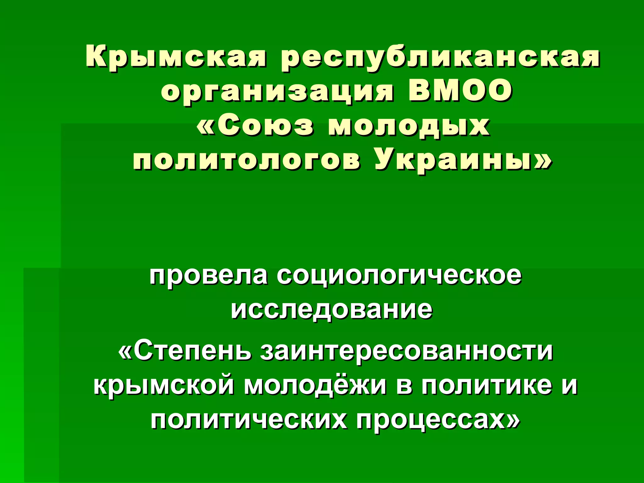 Крымская республиканская организация ВМОО 'Союз молодых политологов Украины' провела социологическое исследование, в котором участвовали 900 молодых людей из Симферополя и Сак, чтобы определить их интерес к политике. Результаты показали, что 47,8% симферопольцев и 68% сакчан интересуются политикой, хотя доверие к политическим деятелям и партиям остается низким. Большинство респондентов не принимали участия в выборах и политических активностях, что может свидетельствовать о политическом нигилизме среди молодежи.