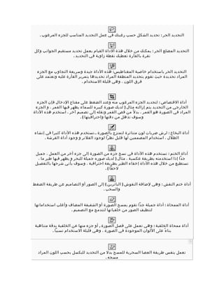 تتحدث الوثيقة عن واجهة صندوق أدوات الفوتوشوب، حيث تحتوي على 22 أداة من أصل 44. يتم شرح أدوات التحديد المختلفة وخصائصها، مثل أداة التحديد المستطيل، البيضاوي، وطرق استخدام أدوات القص والتعديل. كما تتناول بعض الأدوات المتعلقة بالرسم والتلوين مثل أداة البخاخ والممحاة والتشويش.