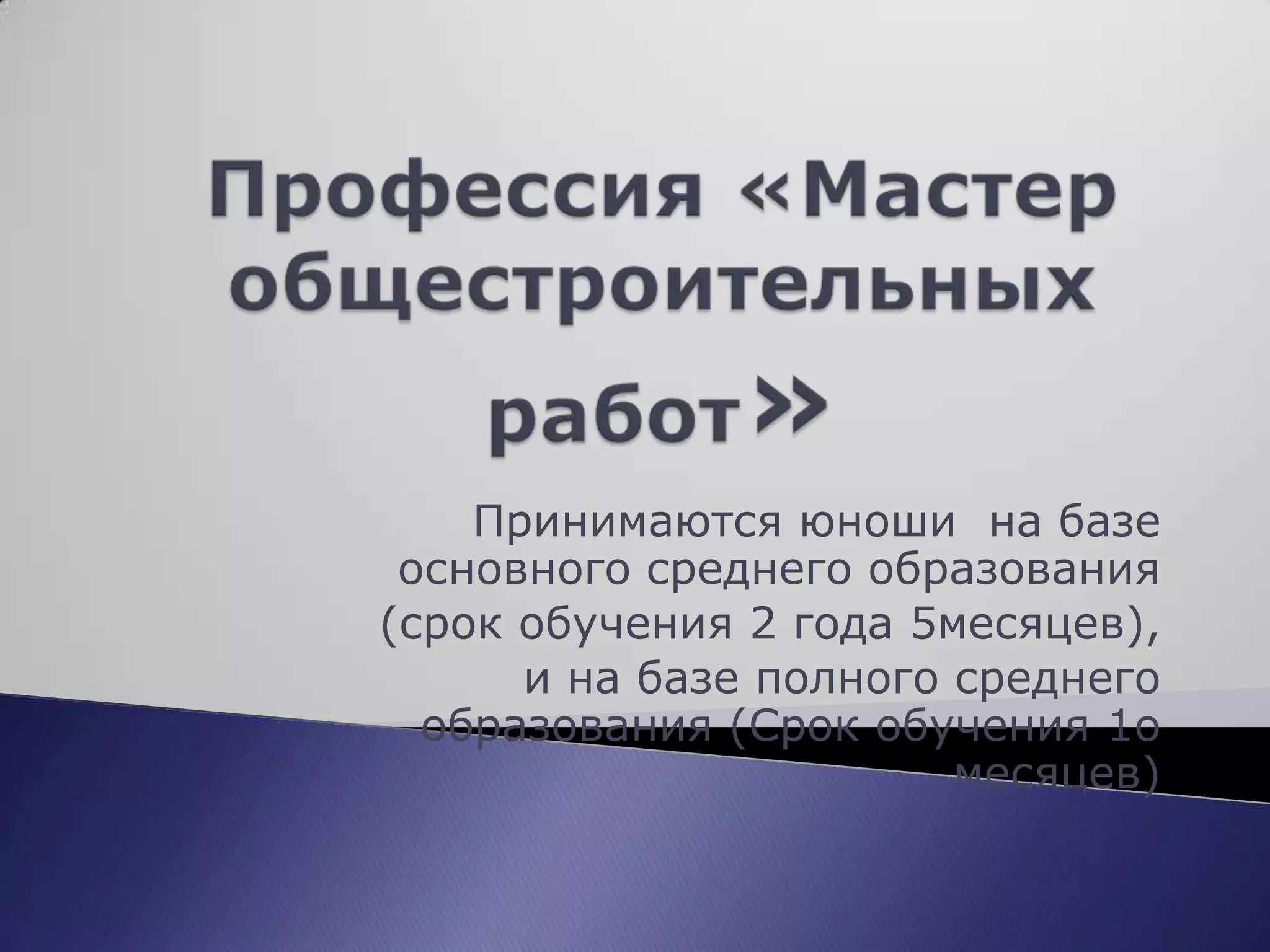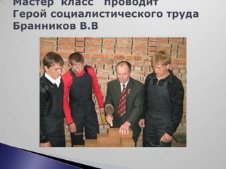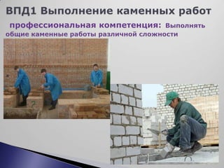 Документ описывает условия приема на обучение по специальностям электросварщик и каменщик на базе основного и полного среднего образования. В нем указаны сроки обучения, профессиональные компетенции и основные навыки, которые студенты должны освоить, такие как сварка и контроль качества каменных работ. Также рассматриваются методы работы с электродом и использование сварочного оборудования.