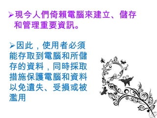 現今人們倚賴電腦來建立、儲存 和管理重要資訊。 因此,使用者必須 能存取到電腦和所儲 存的資料,同時採取 措施保護電腦和資料 以免遺失、受損或被 濫用