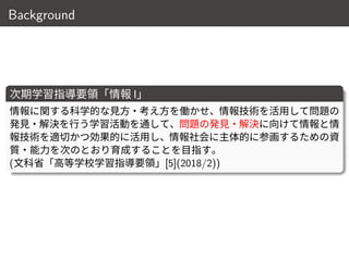 Background 次期学習指導要領「情報 I」 情報に関する科学的な見方・考え方を働かせ、情報技術を活用して問題の 発見・解決を行う学習活動を通して、問題の発見・解決に向けて情報と情 報技術を適切かつ効果的に活用し、情報社会に主体的に参画するための資 質・能力を次のとおり育成することを目指す。 (文科省「高等学校学習指導要領」[5](2018/2)) 2 /