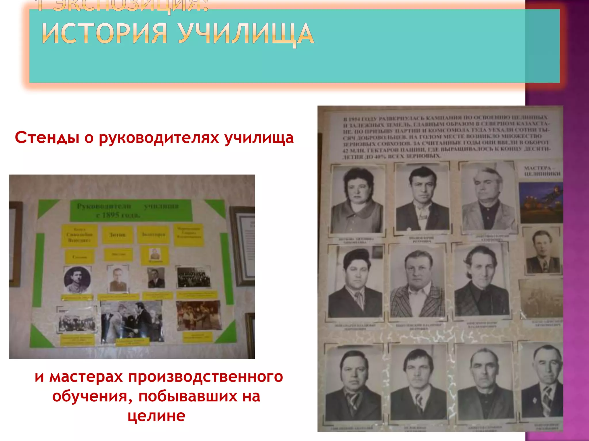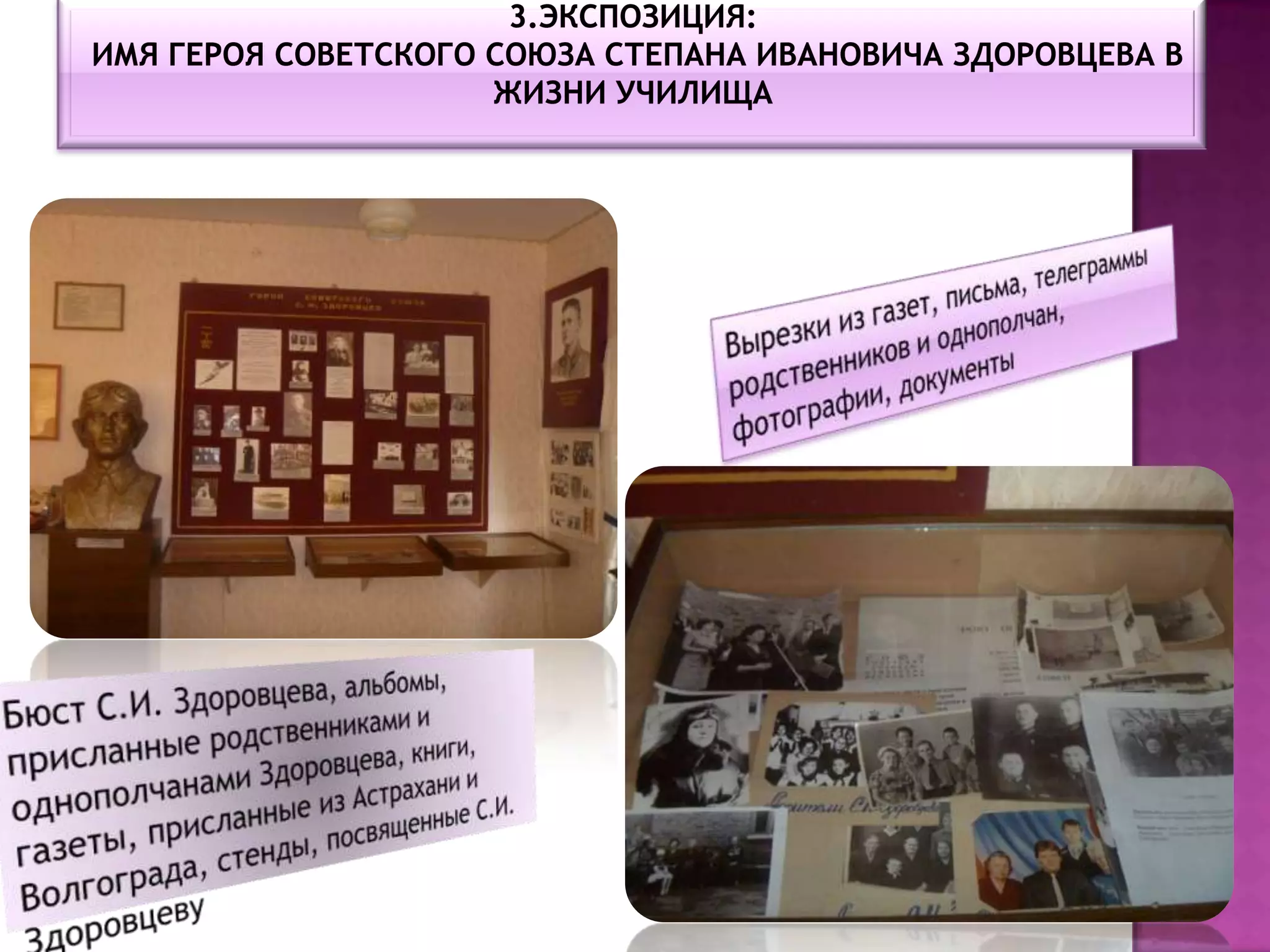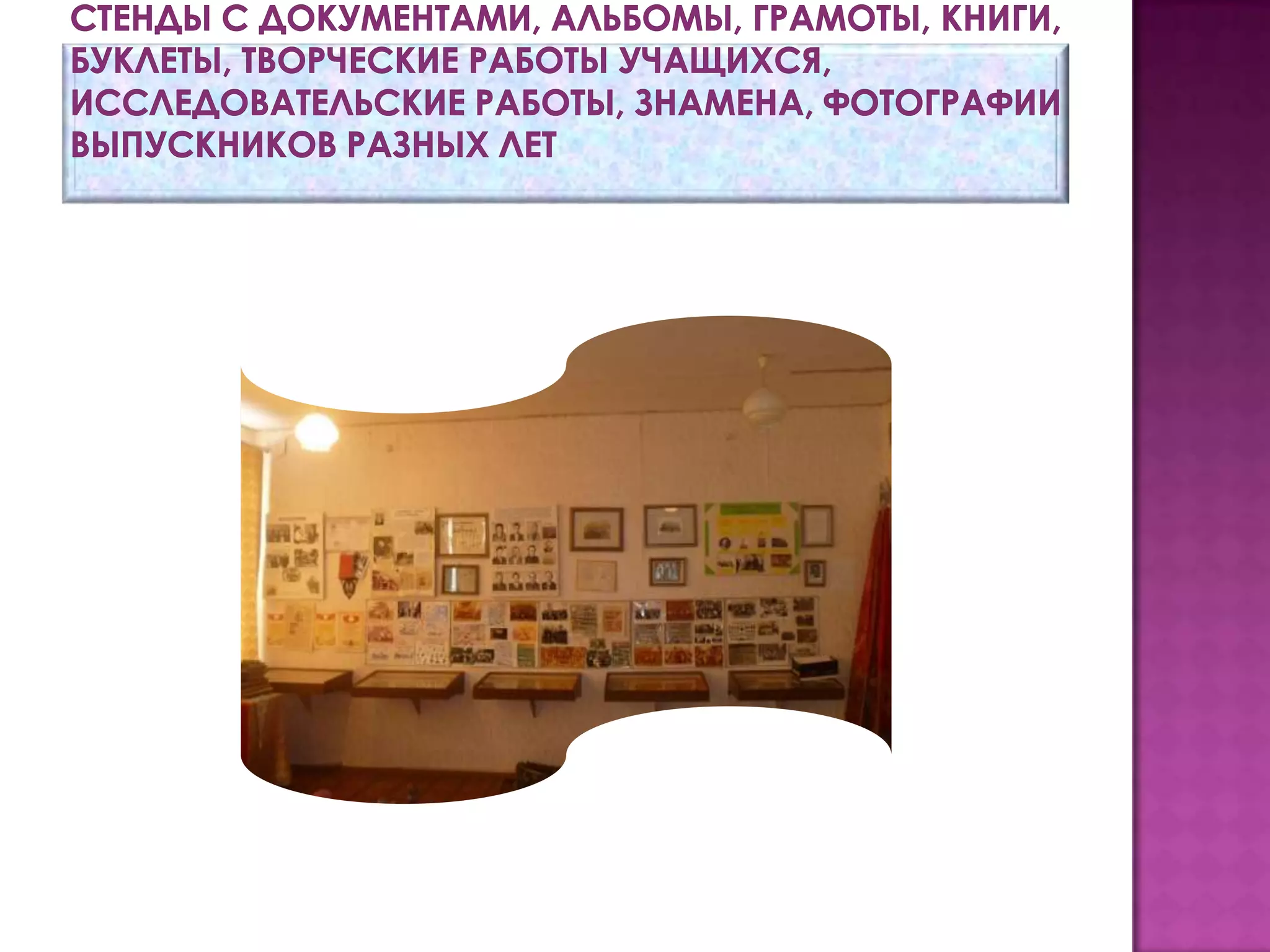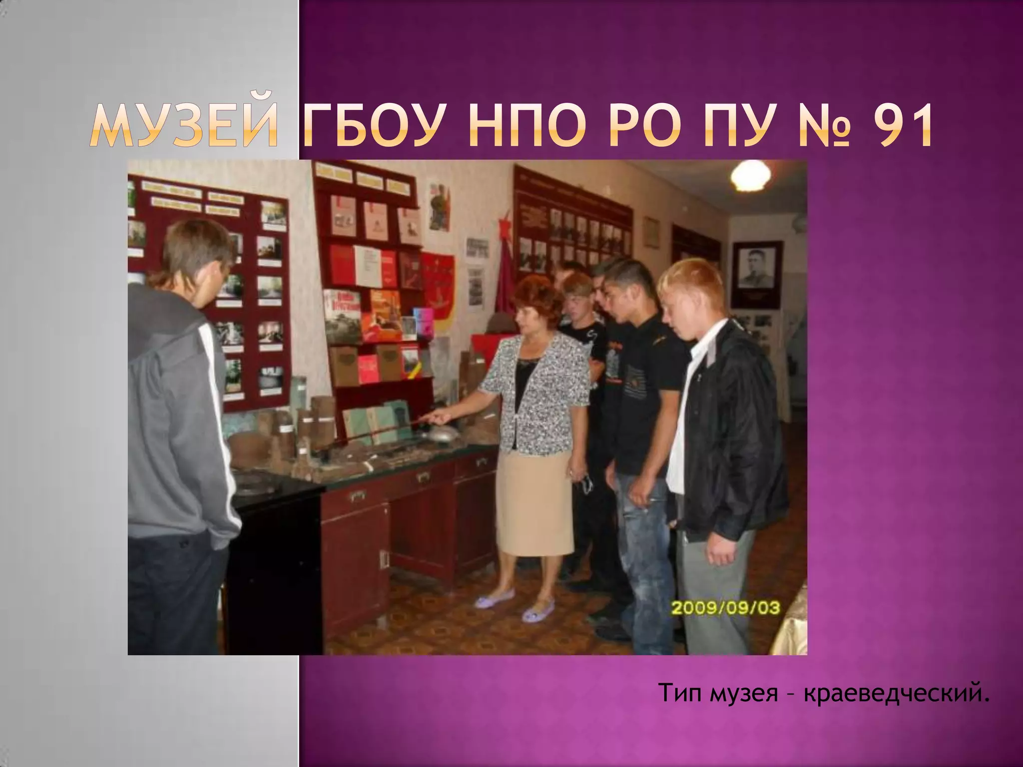 Документ описывает краеведческий музей, который содержит стенды о руководителях училища, мастерах производственного обучения и участниках войны, окончивших училище. В музее представлены личные вещи, письма, документы и награды, а также коллекции утюгов, фотоаппаратов начала 19 века, платков и монет.