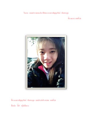 มาจากโรงเรียน ยุพราชวิทยาลัย เชียงใหม เนื้อหา/วิชาคอมพิวเตอร ที่เคยเรียนมา ไดแก / Microsoft Word / Microsoft Excel / Microsoft Powerpoint อื่น ๆ photoshop โปรแกรมที่ถนัด Microsoft Word โปรแกรมที่อยากใหโรงเรียนจัดการเรียนการสอน – 5. มีเครืองคอมพิวเตอรใชสวนตัว ่ มี ถามีคอมพิวเตอร ใชอนเทอรเน็ตดวยหรือไม ิ ใช 6. ความใฝฝนในอนาคต อยากเปนแอรฮอทสเตท คติธรรมประจําใจ เก็บความผิดพลาดในอดีต มาเปนบทเรียนสําหรับอนาคต สิ่งที่ตองการใหทางโรงเรียนจัดใหกับนักเรียน ขอมูลเพิ่มเติม 7. คะแนนเฉลี่ยมัธยมศึกษาตอนตน 3.00 จากโรงเรียนยุพราชวิทยาลัย เชียงใหม จังหวัด เชียงใหม 8. คะแนนเฉลี่ย ม.5 3.08 9. ทักษะ/ความสามารถพิเศษ รองเพลง 10. การไดรับรางวัลเกียรติบัตร(ชื่อ-ไดรับจาก) - 11. อยากเรียนตอดานใด ศึกษาศาสตร สาขาวิชาภาษาไทย