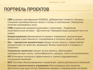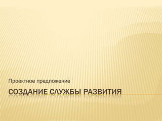 Документ представляет проектное предложение по созданию службы развития, направленной на повышение качества услуг, снижение затрат и улучшение управления проектами в компании. Основные аспекты включают систему стратегического управления, бюджетирование, внедрение KPI и CRM, а также управление знаниями и документами. Служба служит единым центром компетенции и консалтинга, обеспечивая поддержку и обучение для сотрудников.