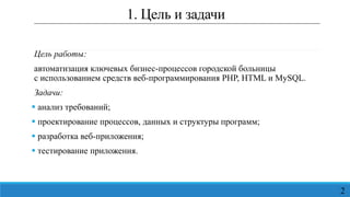 В дипломной работе рассматривается автоматизация ключевых бизнес-процессов городской больницы с использованием веб-программирования. Основные задачи включают анализ требований, проектирование и разработку веб-приложения, а также его тестирование. Результаты показывают успешное выполнение требований и высокую работоспособность приложения.