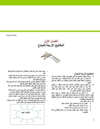 ﺍﻟﻔﺼﻞ ﺍﻷﻭﻝ ﺍﻟﻤﻔﺎﺗﻴﺢ ﺍﻷﺭﺑﻌﺔ ﻟﻠﻨﺠﺎﺡ ﺳﻮﻑ ﺍﺣﺼﻞ ﻋﻠﻰ ﻣﺎﻻ ﻳﻘﻞ ﻋﻦ 08 ﻓﻲ ﻣﺎﺩﺓ ﺍﻟﻔﻴﺰﻳﺎء ﻭﺍﻟﺘﻤﺘﻊ ﺑﻔﻌﻞ - ﺫﻟﻚ. ﺍﻟﻤﻔﺎﺗﻴﺢ ﺍﻷﺭﺑﻌﺔ ﻟﻠﻨﺠﺎﺡ ﺳﻮﻑ ﺃﺣﺴﻦ ﻣﻦ ﺩﺭﺟﺎﺗﻲ ﻓﻲ ﻛﻞ ﺍﻟﻤﻮﺍﺩ ﺑﻨﺴﺒﺔ 5 % ﺧﻼﻝ ﺍﻟﻔﺼﻞ - 1. ﺍﻋﺮﻑ ﺍﻟﻨﺘﻴﺠﺔ ﺍﻟﺨﺎﺻﺔ ﺑﻚ. ﻟﻜﻲ ﺗﻨﺠﺢ ﻳﺠﺐ ﻋﻠﻴﻚ ﺃﻥ ﺗﻌﺮﻑ ﻣﺘﻰ ﻛﻨﺖ ﺍﻟﺪﺭﺍﺳﻲ. ﺍﺑﺘﺪﺍء ﻣﻦ ﻫﺬﺍ ﺍﻟﻔﺼﻞ ﺍﻟﺪﺭﺍﺳﻲ ﺃﻧﺎ ﺍﺷﻌﺮ ﺑﺎﻟﻤﺘﻌﺔ ﺑﺎﺑﺘﻜﺎﺭ ﻗﺪ ﻧﺠﺤﺖ ﺃﻭ ﻋﻠﻰ ﺍﻷﻗﻞ ﺃﻳﻦ ﺃﻧﺖ ﺑﺎﻟﻨﺴﺒﺔ ﻟﻬﺪﻓﻚ , ﺩﻭﻥ ﻫﺪﻑ ﻣﺤﺪﺩ ﻃﺮﻕ ﺟﺪﻳﺪﺓ ﻟﻔﻌﻞ ﺫﻟﻚ . ﻭﻭﺍﺿﺢ ﻻ ﻳﻤﻜﻨﻚ ﺗﻘﻴﻴﻢ ﻭﺿﻌﻚ ﺍﻟﺤﺎﻟﻲ ﻭﺗﻘﺪﻣﻚ ﺃﻭ ﻣﺎ ﺗﻔﺘﻘﺮ ﺇﻟﻴﻪ ﻟﻜﻲ ﻧﻼﺣﻆ ﺃﻥ ﺍﻟﻬﺪﻓﻴﻦ ﺍﻵﺧﺮﻳﻦ ﻗﺪ ﻛﺘﺒﺎ ﺑﺼﻴﻐﻪ ﺍﻟﺤﺎﺿﺮ ﻻﻥ ﺫﻟﻚ ﻳﻮﺣﻲ ﻟﻚ - ﺗﻨﺠﺢ . ﺑﺄﻧﻚ ﺗﺤﻮﻡ ﺣﻮﻝ ﻫﺪﻓﻚ ﻭﻳﺠﻌﻠﻚ ﺗﺤﻘﻖ ﺃﻫﺪﺍﻓﻚ. 2. ﻣﻦ ﺍﻟﻤﻬﻢ ﺃﻥ ﺗﻜﻮﻥ ﺩﻗﻴﻘﺎ ﻗﺪﺭ ﺍﻹﻣﻜﺎﻥ ﻋﻨﺪ ﺗﺤﺪﻳﺪ ﺃﻫﺪﺍﻓﻚ . ﺇﻥ ﺍﻟﻘﻮﻝ ﻭﻣﻊ ﻛﻞ ﻫﺪﻑ ﻻﺣﻖ ﺗﻜﻮﻥ ﺍﻟﺘﻔﺎﺻﻴﻞ ﺃﻛﺜﺮ ﺩﻗﺔ ﻭﻛﻠﻤﺎ ﻛﺎﻧﺖ ﺃﻛﺜﺮ ﺩﻗﺔ - ﺃﻧﻚ ﺗﺮﻳﺪ ﺃﻥ ﺗﻜﻮﻥ ﻃﺎﻟﺒﺎ ﺟﻴﺪﺍ ﻟﻴﺲ ﻛﺎﻑ .ﻭﺍﻥ ﺗﻘﻮﻝ ﺑﺄﻧﻚ ﺗﺮﻳﺪ ﻛﺎﻥ ﺫﻟﻚ ﺃﻓﻀﻞ ﻭﺃﻓﻀﻞ. ﺍﻟﺤﺼﻮﻝ ﻋﻠﻰ ﺩﺭﺟﺎﺕ ﺟﻴﺪﺓ ﻏﻴﺮ ﻭﺍﻑ ﺃﻳﻀﺎ ﻭﻓﻴﻤﺎ ﻳﻠﻲ ﺃﻓﻀﻞ ﺇﻥ ﺍﻟﻌﻘﻞ ﺍﻟﺒﺸﺮﻱ ﻻ ﻳﺴﺘﻄﻴﻊ ﺗﻤﻴﻴﺰ ﺍﻟﻔﺮﻭﻕ ﺑﻴﻦ ﺷﻲ ﻗﺪ ﺣﺪﺙ ﻓﻌﻼ - ﺃﻭﺻﺎﻑ ﻣﺘﺰﺍﻳﺪﺓ ﻷﻫﺪﺍﻑ ﺷﺨﺺ ﻣﺎ. ﻭﺷﻲء ﺗﻢ ﺗﺼﻮﺭﻩ ﺑﻮﺿﻮﺡ ﺇﻧﻬﺎ ﺗﻘﻨﻴﺔ ﺍﻟﻐﺶ ) ﻛﺎﺷﻒ ﺍﻟﻜﺬﺏ (. ﺃﻧﺎ ﻻ ﺃﻗﻮﻝ ﺑﺎﻥ ﻫﺬﻩ ﻳﻨﺒﻐﻲ ﺃﻥ ﺗﻜﻮﻥ ﺃﻫﺪﺍﻓﻚ ﺑﻞ ﻳﺠﺐ ﻋﻠﻴﻚ 3. ﻭﺃﺧﻴﺮً ، ﺗﺄﻛﺪ ﺑﺄﻧﻬﺎ ﺗﺸﻤﻞ ﺷﻲء ﺃﻧﺖ ﺗﺴﺘﻤﻊ ﺑﻪ ﻭﻓﻴﻬﺎ ﺇﻣﺎ ﺇﺑﺪﺍﻉ ﺃﻭ ﺍ - ﺍﺧﺘﻴﺎﺭ ﺍﻷﻫﺪﺍﻑ ﺍﻟﺨﺎﺻﺔ ﺑﻚ ﻭﺑﺸﻜﻞ ﻭﺍﺿﺢ ﻭﺩﻗﻴﻖ ﻗﺪﺭ ﻣﺎ ﺗﺴﺘﻄﻴﻊ ..ﻳﺠﺐ ﻣﺘﻌﺔ ﺃﻭ ﻓﺎﺋﺪﺓ ﺃﻭ ﺳﻌﺎﺩﺓ ﺃﻭ ﺇﺛﺎﺭﺓ ﺃﻭ ﻣﺮﺡ ﺃﻭ ﺣﺐ . ﻋﻠﻴﻚ ﺃﻥ ﺗﺸﻌﺮ ﻋﻠﻴﻚ ﺃﻥ ﻻ ﺗﺄﺧﺬ ﺃﻫﺪﺍﻑ ﺃﻱ ﺷﺨﺺ ﻣﺎ ﻭﺗﻌﺘﺒﺮﻫﺎ ﺃﻫﺪﺍﻓﻚ ﻣﺎ ﻟﻢ ﺗﻜﻦ ﻣﺘﻄﺎﺑﻘﺔ ﻧﻔﺴﻚ ﺃﻧﻚ ﺗﺨﻮﺽ ﻣﻌﺮﻛﺔ ﺷﺎﻗﻪ ﺍﺟﻌﻠﻬﺎ ﻣﻘﻨﻌﺔ . ﻣﻊ ﺍﻫﺘﻤﺎﻣﺎﺗﻚ ﻭﺗﻄﻠﻌﺎﺗﻚ . ﺍﻵﻥ ﺧﺬ ﻭﺭﻗﺔ ﻭﺍﻛﺘﺐ ﻓﻴﻬﺎ ﻓﻴﻤﺎ ﻻ ﻳﺰﻳﺪ ﻋﻦ ﺩﻗﻴﻘﺔ ﺃﻭﻝ ﻋﺸﺮ ﺗﻌﺮﻳﻔﺎﺕ - ﺃﻭﺩ ﺃﻥ ﺃﻛﻮﻥ ﻃﺎﻟﺒﺎ ﺟﻴﺪﺍ. ﺃﻭ ﻛﻠﻤﺎﺕ ﺗﺮﺗﺒﻂ ﺑﺎﻟﻜﻠﻤﺔ ﺍﻟﻤﻮﺟﻮﺩﺓ ﻓﻲ ﺍﻟﺸﻜﻞ ﺍﻟﺘﺎﻟﻲ • ﺳﻴﻜﻮﻥ ﻣﻦ ﺍﻟﺮﺍﺋﻊ ﺍﻟﺤﺼﻮﻝ ﻋﻠﻰ ﻋﻼﻣﺎﺕ ﺟﻴﺪﺓ. • ﺃﺭﻳﺪ ﺃﻥ ﺃﺣﺼﻞ ﻋﻠﻰ ﺩﺭﺟﺎﺕ ﺃﻓﻀﻞ. ﺃﺭﻳﺪ ﺃﻥ ﺃﺣﺴﻦ ﻣﻦ ﺩﺭﺟﺎﺗﻲ ﻓﻲ ﺍﻟﻤﻮﺍﺩ ﺍﻟﻌﻠﻤﻴﺔ. • ﺳﻮﻑ ﺃﺣﺼﻞ ﻋﻠﻰ ﺗﻘﺪﻳﺮ ﺟﻴﺪ ﺟﺪﺍ ﺃﻭ ﻣﻌﺪﻝ 08 ﻓﻲ ﻣﺎﺩﺓ • ﺍﻟﻔﻴﺰﻳﺎء. 2
