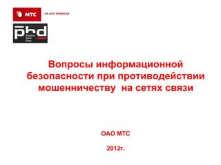 Документ рассматривает вопросы информационной безопасности и противодействия мошенничеству в сетях связи, отмечая значительные финансовые потери операторов связи от мошеннических действий. В нем обсуждаются основные угрозы, такие как взлом IP-PBX, SMS-фрод и нелегальная терминация трафика, а также описываются способы защиты от них. Также акцентируется внимание на необходимости повышения мер безопасности в условиях роста мобильных угроз и появления новых уязвимостей.