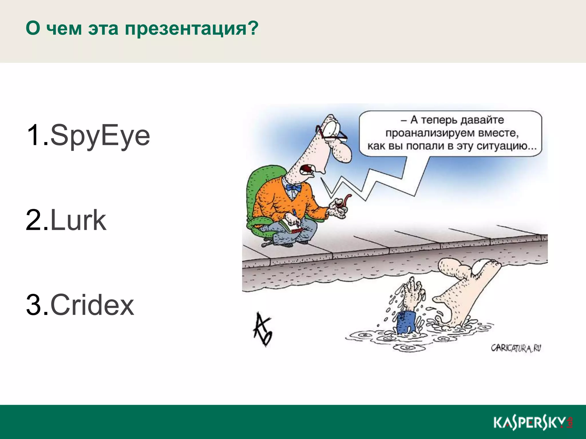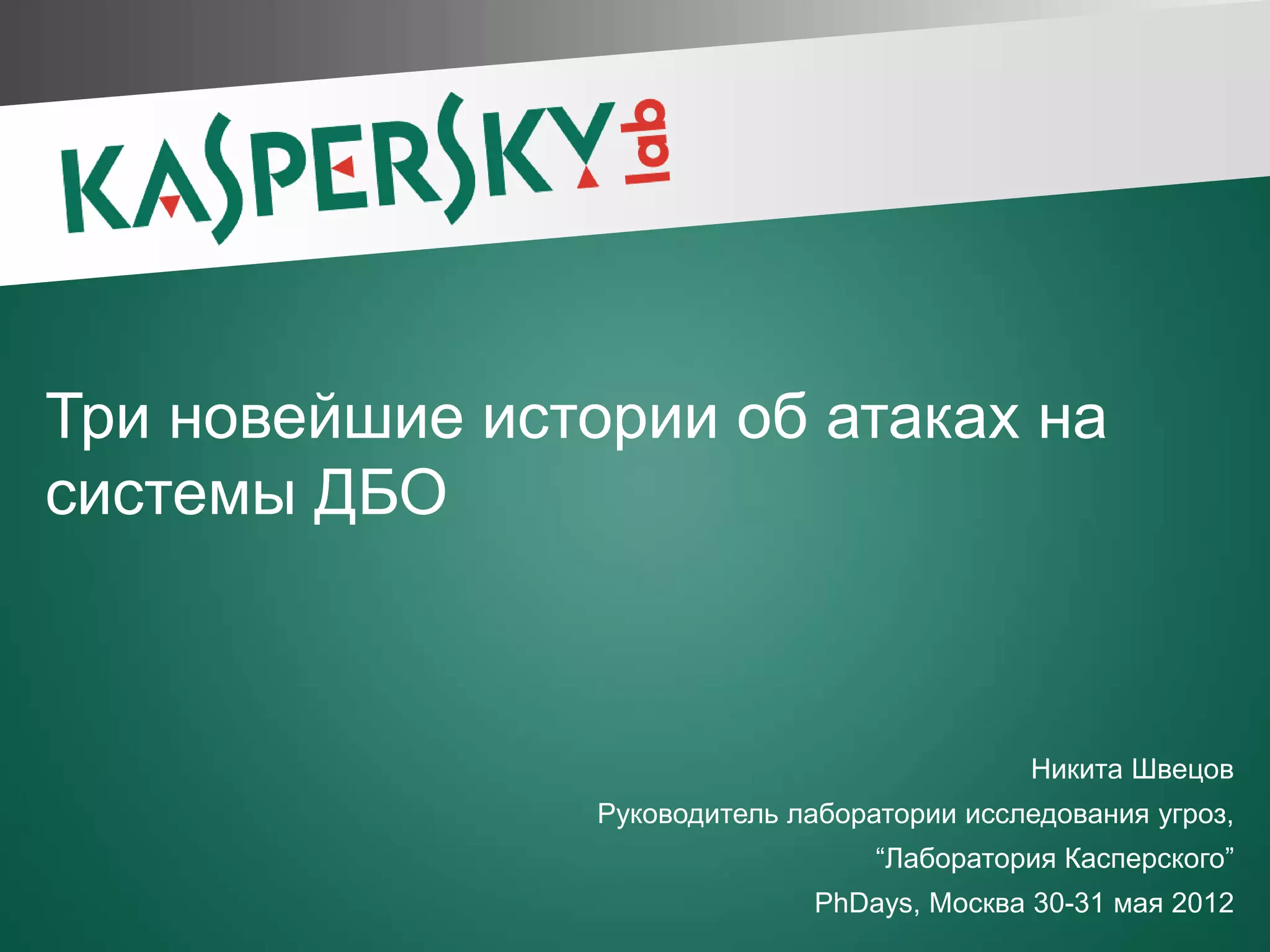 Презентация Никиты Швецова на PhDays 2012 фокусируется на трех последних атаках на системы дистанционного банковского обслуживания: Spyeye, Lurk и Cridex. Основные выводы подчеркивают, что все трояны используют веб-инъекции и методы социальной инженерии для распространения, с акцентом на необходимость обучения пользователей для борьбы с этими угрозами. Лаборатория Касперского уверенно справляется с эксплойтами и веб-инъекциями в своих продуктах.