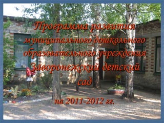 Документ описывает программу развития муниципального детского сада Заворонежа на 2011-2012 годы, включая информацию о структуре учреждения, составе коллектива, результатах диагностики уровня развития детей, а также выявленные затруднения и нерешенные проблемы. Основное внимание уделяется созданию условий для индивидуального развития и здоровья детей, применению новых образовательных технологий и вовлечению родителей в воспитательный процесс. Описаны ключевые задачи, методологические принципы и этапы внедрения программы, направленной на повышение качества образовательных услуг и улучшение здоровья воспитанников.